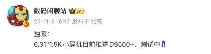 这位博主此前的爆料中还提到过,“6.31"1.5K小屏机当今鼓吹D9500+,测试中”。其中莫得严防的居品系列信息,但相关预计以为这款手机有可能是 iQOO 旗下居品。