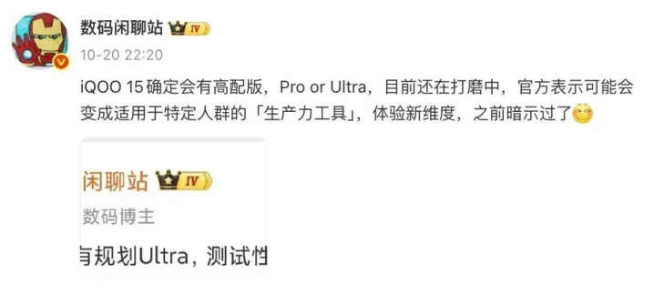 另外,这位博主本年10月的一份音书中提到过:“iQOO 15细目会有高配版,Pro or Ultra,当今还在打磨中,官方清楚可能会酿成适用于特定东说念主群的「坐褥力器具」,体验新维度,之前暗意过了”。