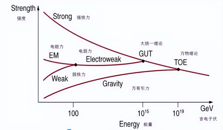 大妥洽表面的中枢论断是:在能量高达 10^15GeV(即 1000 万亿吉电子伏)的顶点条目下,强核力、弱核力和电磁力的强度会趋于相当,三种力将妥洽为电核力。这一能量模范远高于现时东谈主类所能达到的最高能量(大型强子对撞机 LHC 的最高碰撞能量约为 13TeV,即 1.3×10^4GeV),因此无法胜仗通过本质不雅测到电核力的存在,但表面上不错通过推导其粗暴效应来障碍考证。