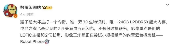 除此以外,博主@数码谈天站 的另一份爆料显现,“耀子超大杯主打一个平衡,惟一对3D生物识别,惟一24GB LPDDR5X超大内存,电板决议亦然罕有的7开首满血百瓦闪充,还有保时捷联名,影像要点是新的LOFIC主摄和2亿长焦,影像王炸是正在尝试小边界量产的内置云台认识机——Robot Phone”。